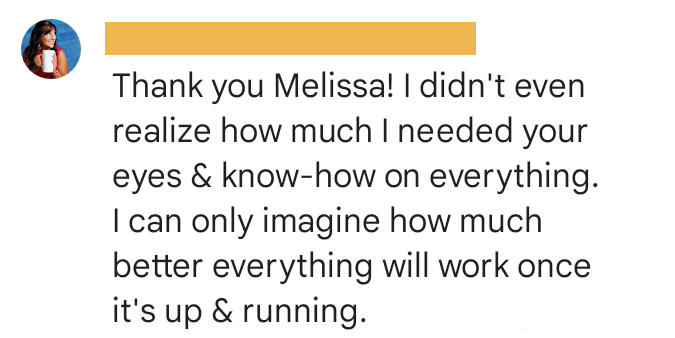 "It would have taken me days to complete what Melissa was able to do in just a few hours. From the initial point of contact to the very end of the Intensive, Melissa made it very easy for me to communicate my needs so she could then follow through on each task. While I'm thrilled with how efficient Melissa was in getting things done, my favorite part is the videos she recorded explaining how to move around on the different platforms so I know what to do on my own when I'm ready to take the next steps."