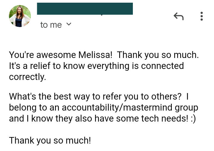 "Melissa is brilliantly tech savvy, and Your Tech BFF is the perfect outlet for her gifting! Your Tech BFF is designed to help people with the behind the scenes tech of their online presence— you know, the part that small business owners, like myself, hate doing because it takes away from the front end tasks involving our clients and the things we love creating!Not only is Melissa a focused and adept researcher, but she actually LOVES trouble-shooting and she is a getter-doner to the 10th degree! Top that all off with the sweetest personality and the heart of a teacher, and that’s what you get when you hire Melissa!I can’t recommend her highly enough!"