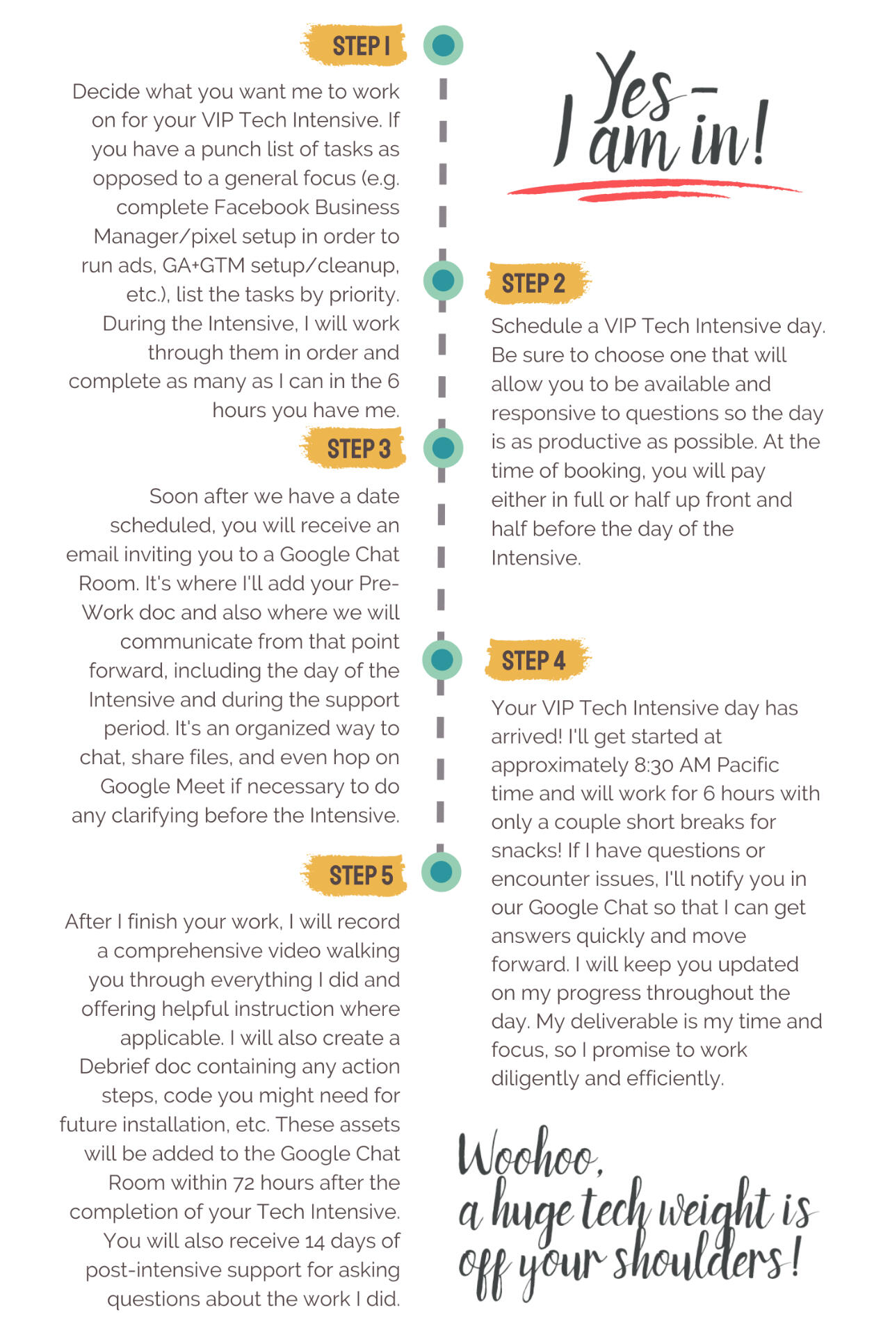 What if I don't currently have enough work for you to do to justify a full 6-hour Intensive?You have a few options here. One is that you could keep a running list of tech tasks as you think of them and then book me when you think you have enough. Another option is to inquire about my Mini Tech Intensive, which is a 3-hour slot dedicated to your business. Those half days can be booked with permission via a direct link if I think I can accomplish what you're asking in that timeframe. (They're also great for adding on to full days if your list is long and we need more time but not necessarily an entire second day.) A third option - which is most appropriate if you have a small tech job that you need done soon - is to purchase a Tech Power Hour which has a turnaround time of 2-3 business days.